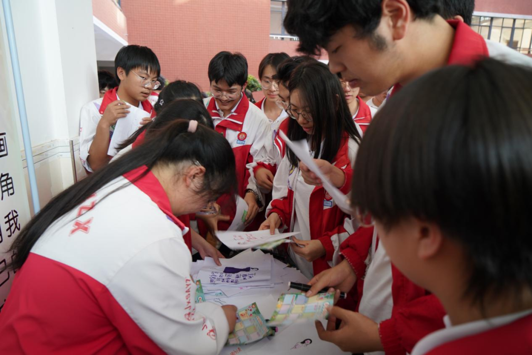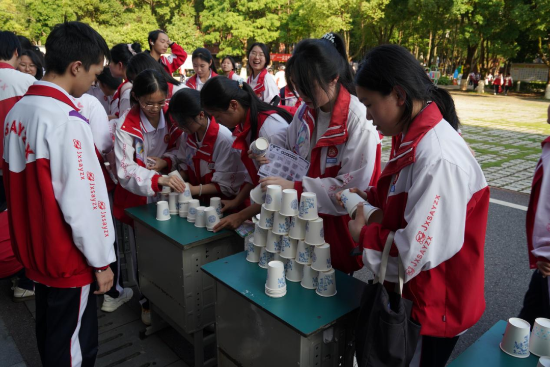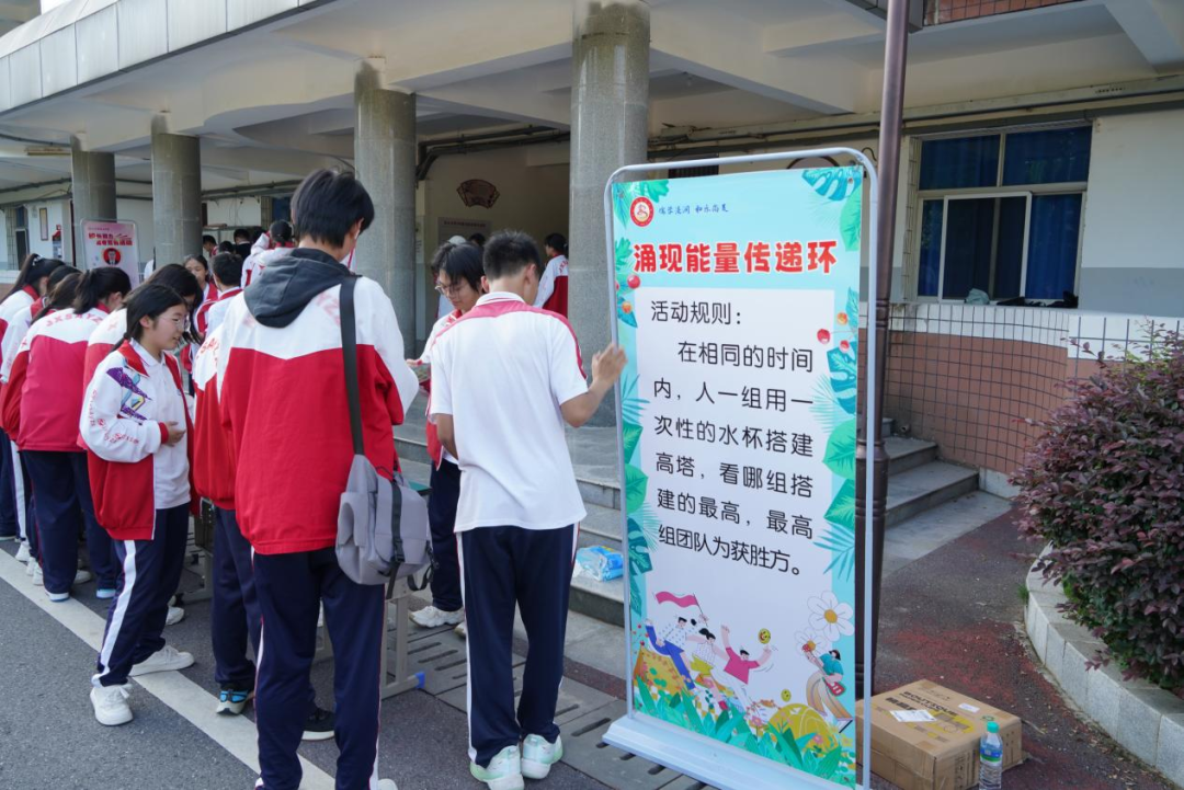 ‘涌现能量传递环‘ 中,4 人一组用一次性水杯搭建高塔,考验团队协作能力。‘混沌祝福发生器‘ 活动里,学生在纸上画下手掌轮廓写上对自己的祝福语,再收集 5 位同学的高考祝福,校园洋溢着温暖与感动。