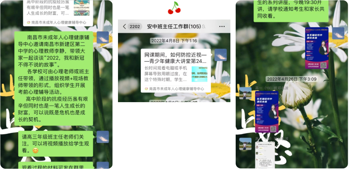3月疫情突发,心理教研组通过学校公众号向师生及家长发布心语信箱、江西省社会心理服务官方公益热线、南昌市疫情心理援助热线、南昌市红十字心理援助中心热线等多种心理求助渠道。