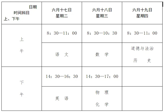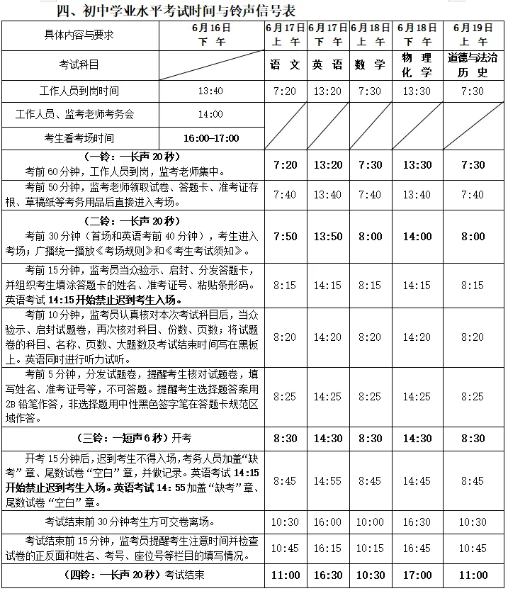 四、初中学业水平考试时间与