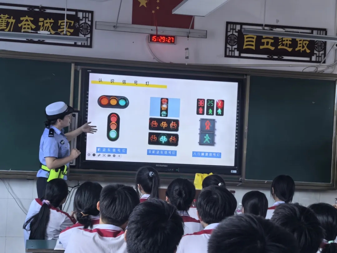 随后,民警结合学生出行实际,系统讲解交通安全核心知识。戴警官先是聚焦‘交通信号灯认知‘,细致拆解机动车、非机动车、人行横道三类信号灯的不同含义,配合大屏幕动态演示,让‘红灯停、绿灯行‘的规则变得更加直观;接着围绕乘车、骑车安全展开讲解,重点强调乘车系好安全带、不乘坐超员车辆,骑车不逆行、不并行等关键要点,尤其突出安全头盔的防护作用。通过数据和案例说明,在骑行事故中,正确佩戴安全头盔能大幅降低头部受伤风险,让学生深刻理解‘小小头盔,生命防线‘的深刻意义。