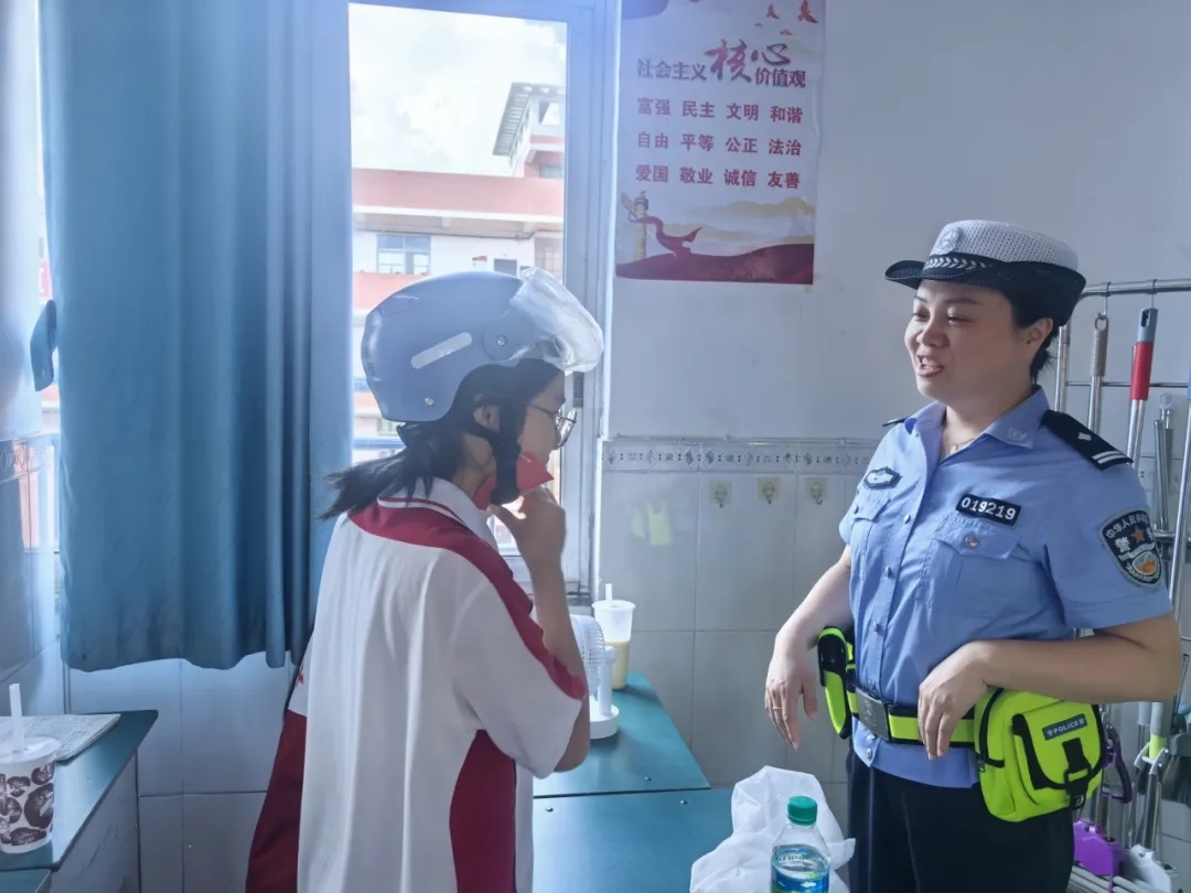 课程结束后,安全教育的延伸仍在继续。在教室角落,民警主动与学生展开一对一交流,面对佩戴头盔咨询骑行安全的同学,民警不仅细致讲解骑行中避让机动车的技巧,还鼓励他们将所学知识分享给自己的家人和朋友,通过‘小手拉大手‘的方式,让交通安全宣传覆盖更多人群。
