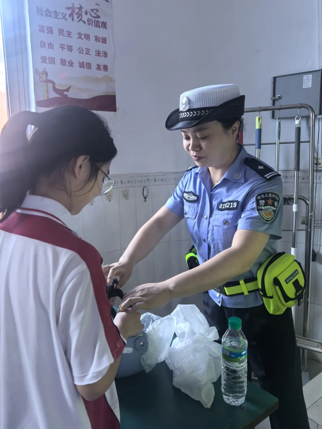 问答结束后,民警带来印有‘安全出行‘字样的安全头盔,邀请答题表现突出的学生上台演示。民警手把手示范头盔的正确佩戴方法,从调整头围大小、系紧安全卡扣、到检查头盔是否稳固贴合,每一个步骤都细致讲解、反复强调,还让学生亲自上手操作,及时纠正佩戴过程中的不规范动作,结合模拟骑行场景,让‘正确戴盔、安全骑行‘的意识真正落地。