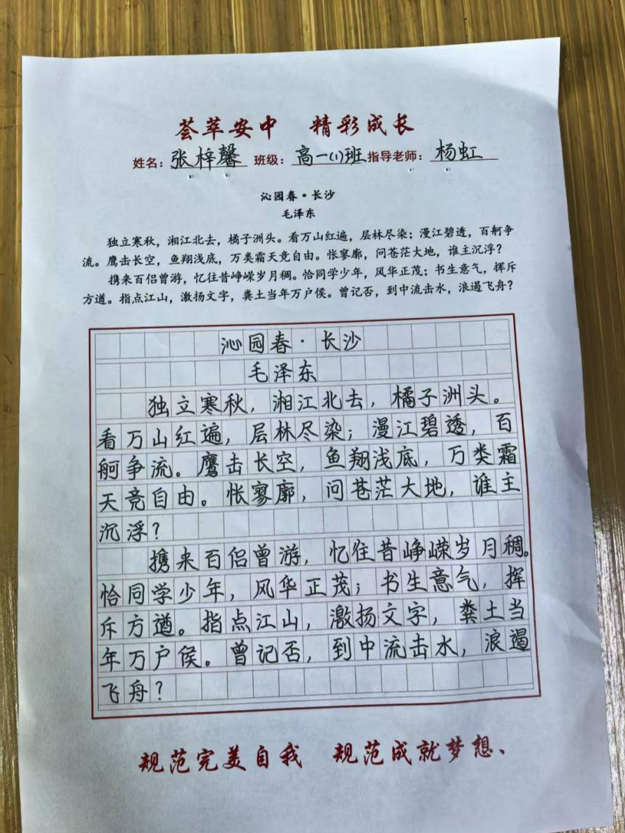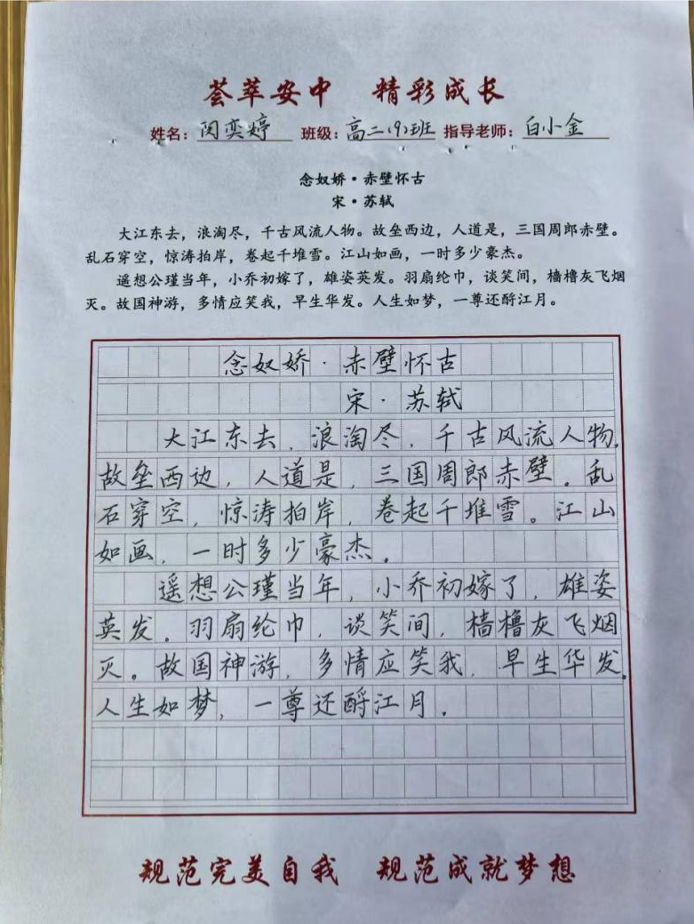 活动现场,高一年级学生书写作品为毛泽东的《沁园春·长沙》,高二年级学生书写作品为苏轼的《念奴娇·赤壁怀古》。两首作品,气势磅礴,学生在专心书写作品中,一方面体验到了前人的宽广胸怀,一方面也感受到了汉字的笔韵流转。