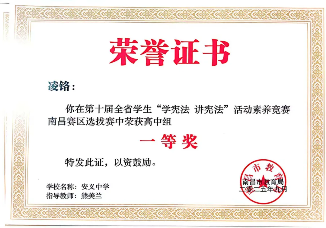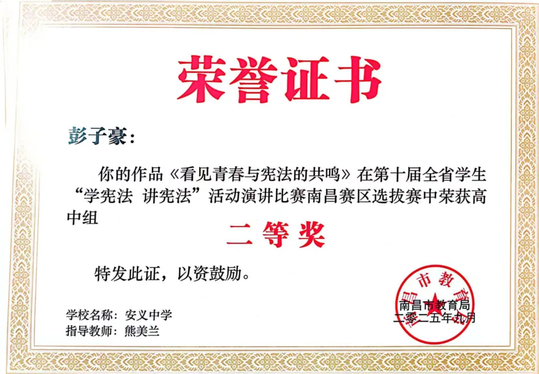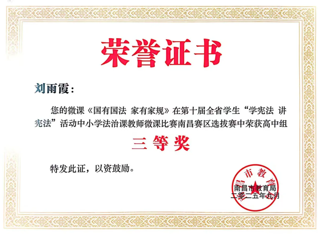 刘雨霞老师的微课作品《国有国法 家有家规》,以生动的案例、通俗的讲解,在中小学法治课教师微课比赛中荣获高中组三等奖;彭子豪同学(指导教师:熊美兰)的演讲作品《看见青春与宪法的共鸣》,用青春视角诠释宪法与成长的联结,在演讲比赛中荣获高中组二等奖;凌铬同学(指导教师:熊美兰)凭借对宪法知识的深刻理解和精准运用,在法治素养竞赛中荣获高中组一等奖。