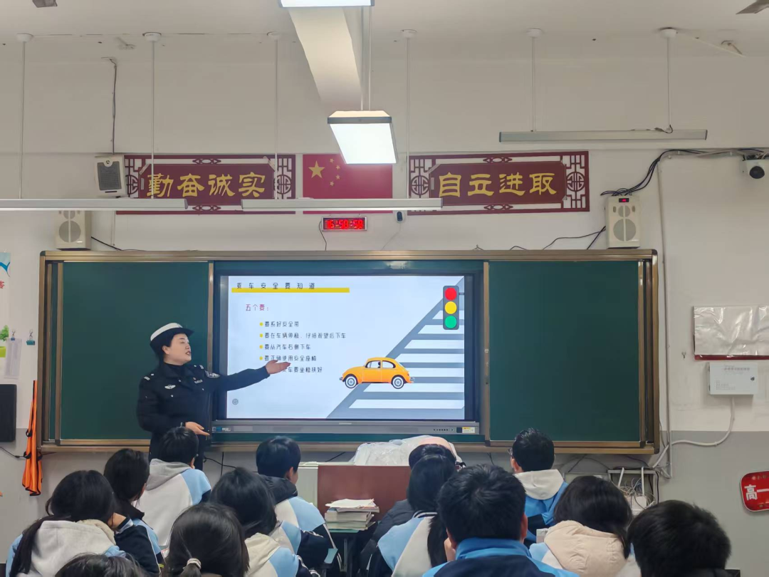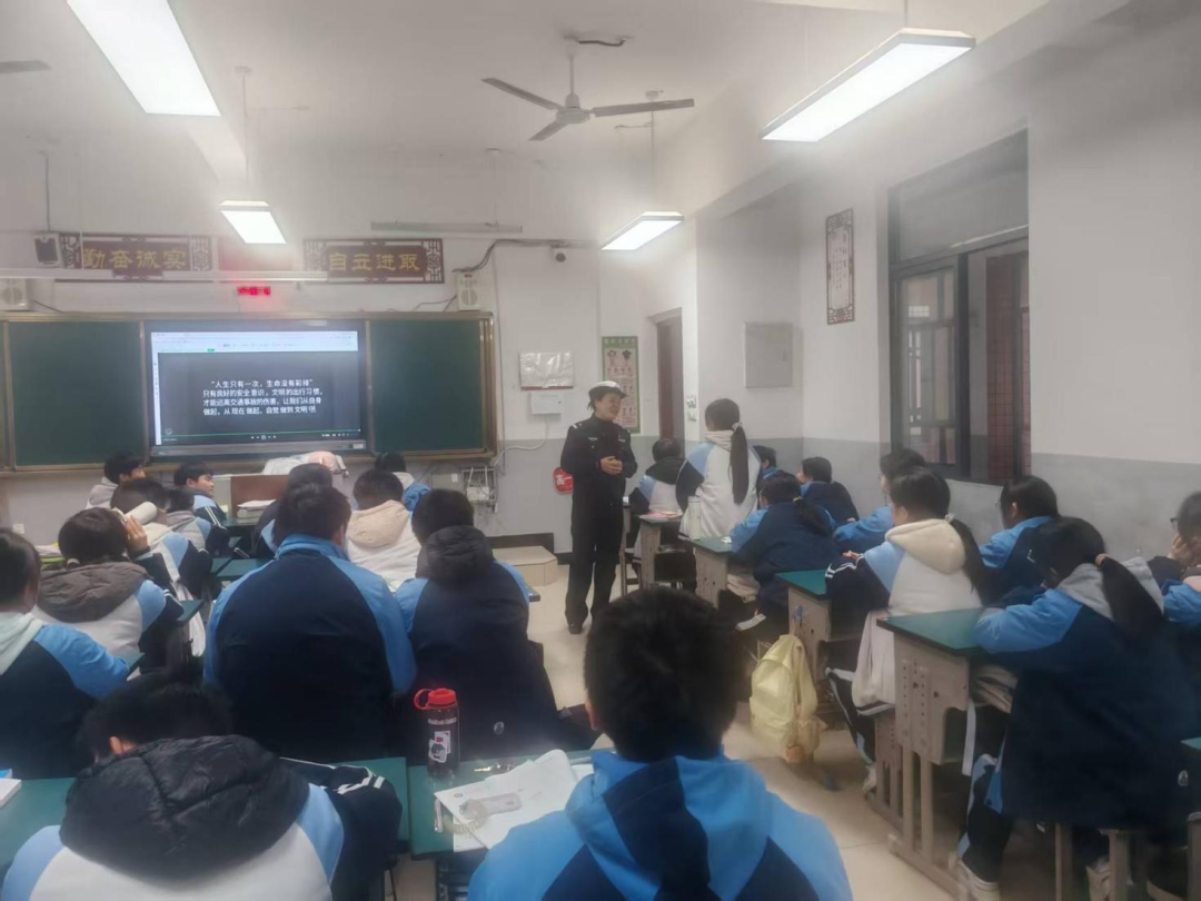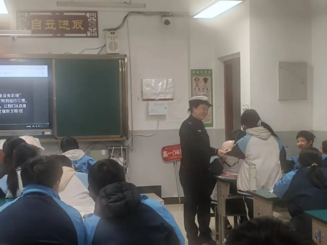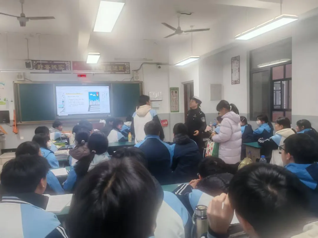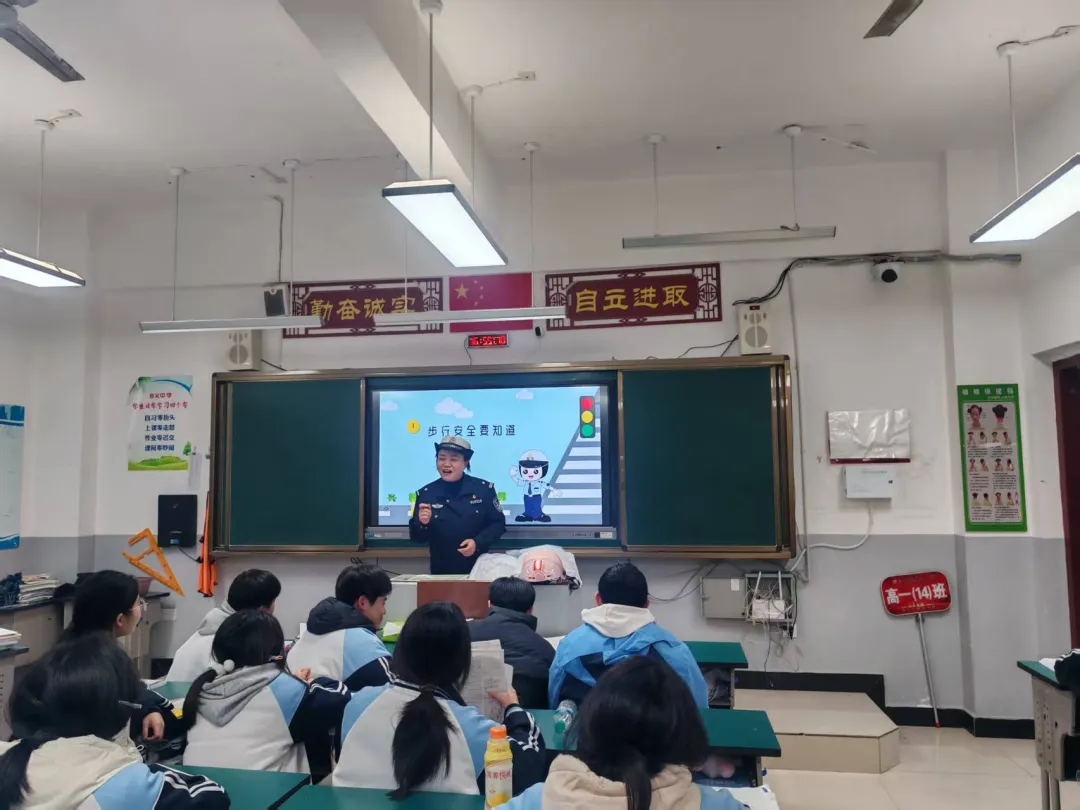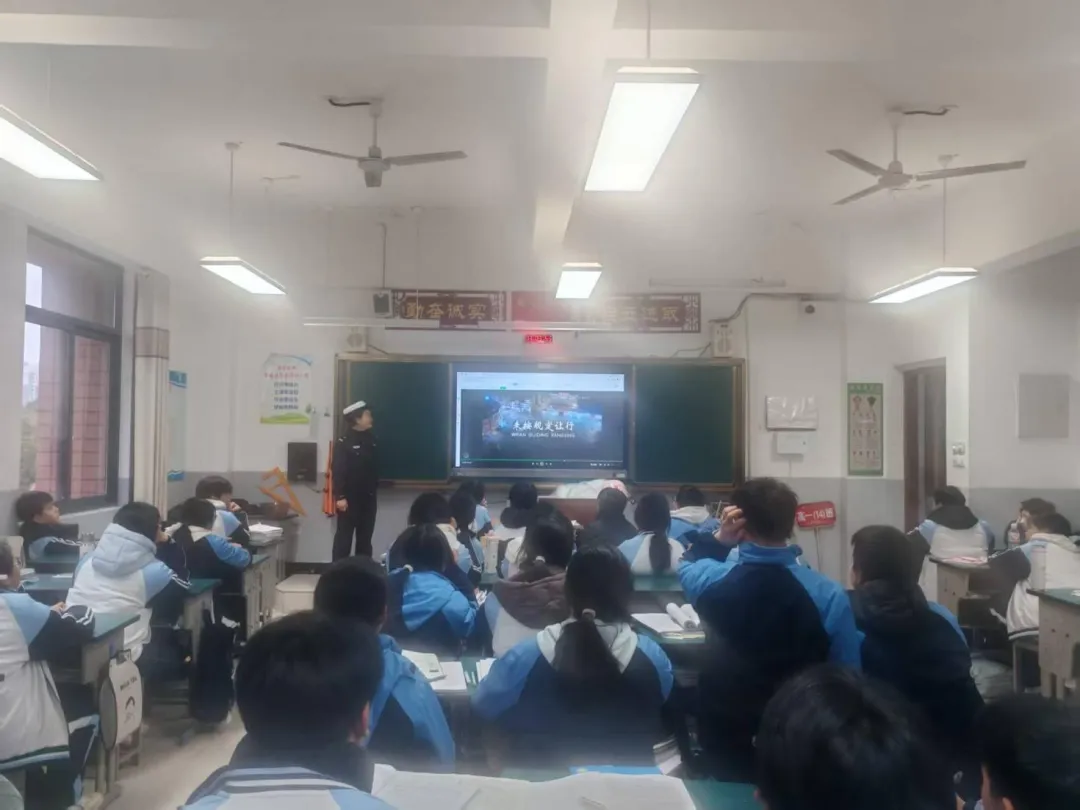 为切实增强学生寒假出行安全意识,提升自我防护能力,筑牢假期道路交通安全防线,2026年2月6日下午,安义中学特邀安义县公安局交管大队戴磊敏警官,为高一(14)班全体同学带来一堂内容详实、实用性强的寒假道路交通安全专题课。