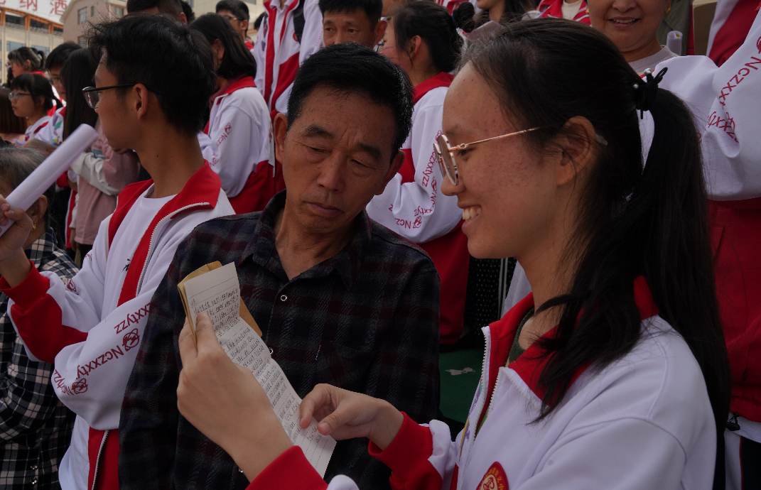 大会进行第五项:家庭互动,共读一封信。学生面对父母或家长说出心里话,倾诉感恩心,用3至5分钟的时间,宣读至家长的一封信。亲子活动环节,将期中表彰大会推向高潮。