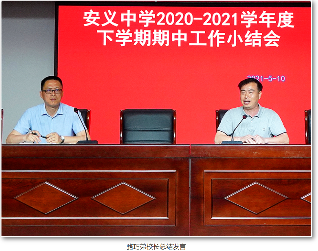 骆巧弟校长作总结发言。第一,学校环境持续优化。教室门和讲台更换,破旧篮球场维修了,学校绿化升级了,整个校园越来越靓丽了,校园越来越干净整洁!第二,育人环境不断改善。学校举行了远足、红五月歌咏比赛、盛大的期中考试表彰家长会、青春期异性交往讲座等创新活动。第三,教学成绩稳中有升。高三年级南昌市二模一本上线154人,本科上线427人,合计上线581人,且不包含体育艺术生等,高三学生总体每次考试都在进步!第四,师生面貌焕然一新。安中老师尤其是班主任在学校时间长,敬业精神极佳!学生行为习惯也越来越好!