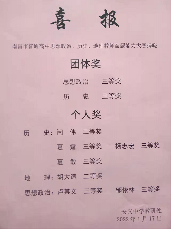 2022年新年伊始,安义中学教学研究捷报频传。在南昌市普通高中化学教师解题能力竞赛中,我校荣获团体二等奖;在南昌市普通高中思想政治、历史、地理教师命题能力大赛中,我校荣获思想政治学科团体三等奖、历史学科团体三等奖。戴西华、黄文斌两位老师均获化学个人一等奖,胡大造、闫伟、陈和善三位老师分获地理学科、历史学科、化学学科个人二等奖,卢其文、邹依林老师获思想政治学科个人三等奖,夏霆、杨志宏、夏敏老师获历史学科个人三等奖,贺菊芳、孔淑婷老师获化学学科个人三等奖。其中我校化学组、历史组派出的参赛老师全部获奖。
