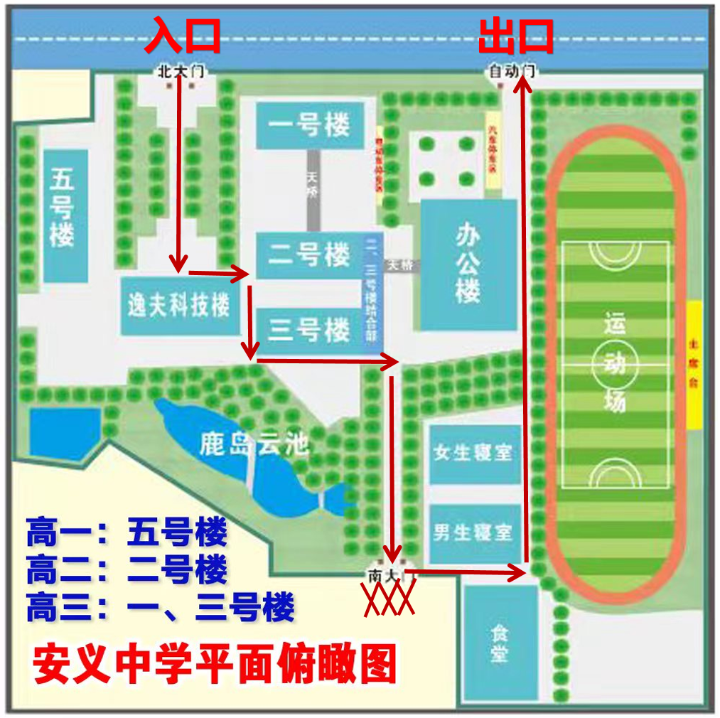 为避免造成拥堵,如驾驶机动车的父母需要帮子女拿行李,请从北大门进入,自动门出,届时南大门将关闭。路线在下方图中用红色箭头标明。