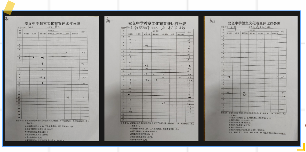 出于公平公正的考虑,此次检查践行跨年级交叉原则,各组组长带领组员依次认真查看了每个班级的教室内部文化布置情况,主要涉及以下几个方面:垃圾桶是否清洗、劳动工具是否规范摆放至架子上、座椅是否对齐、窗帘有没有打结等等。对存在的亮点,检查的同学当场给予充分肯定,对发现的问题也及时予以指导。