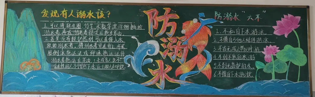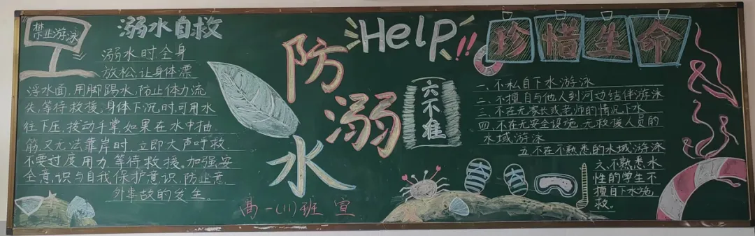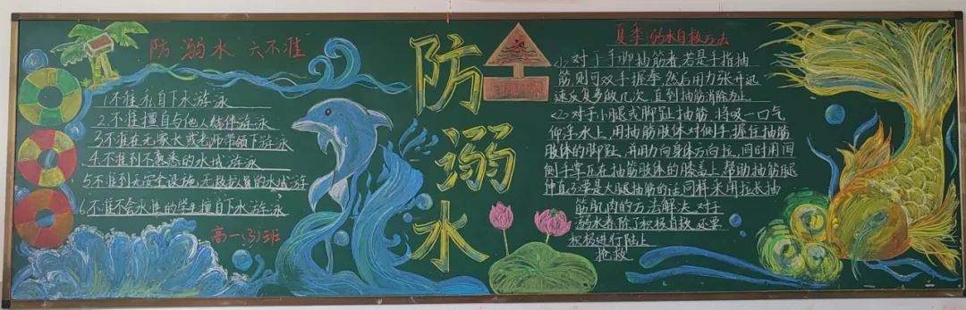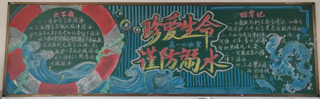 活动中,高一年级各班围绕‘珍爱生命 预防溺水‘主题,精心设计版面,精选内容,同学们自寻‘防溺水‘小知识,力求整洁规范,使黑板报主题突出、内容丰富。在黑板报的创作中,同学们通过文字、图片等多种形式,生动地展示了溺水的危害和防范溺水的重要性。他们有的用醒目的标题和简洁的文字阐述了防溺水的关键要点,有的通过描绘溺水事故的现场情景,警示大家远离危险水域,还有的绘制了可爱的卡通形象,以寓教于乐的方式传递防溺水知识。