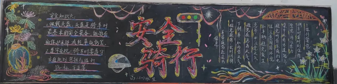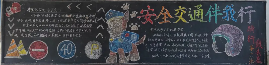 高二年级各班同学在老师的指导下,围绕‘文明交通 你我同行‘这一主题,进行了深入的探讨和创意的发挥。同学们通过搜集资料、设计版面、绘制插图等多种形式,精心制作了一幅幅内容丰富、形式多样的黑板报作品。各班黑板报图文并茂,动画人物栩栩如生:有交通信号知识,过马路应该注意的事项,乘车必须遵守的交通规则等等。可读性、宣传性强,充分体现了知识性、趣味性与实用性的统一,富有非常重要的教育警示意义。