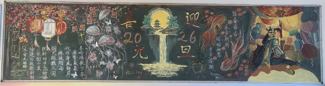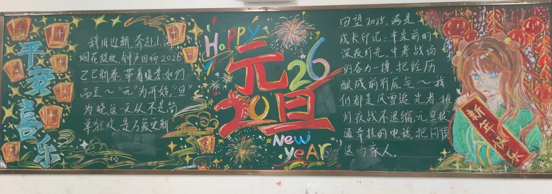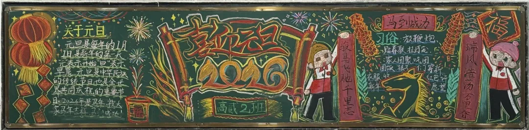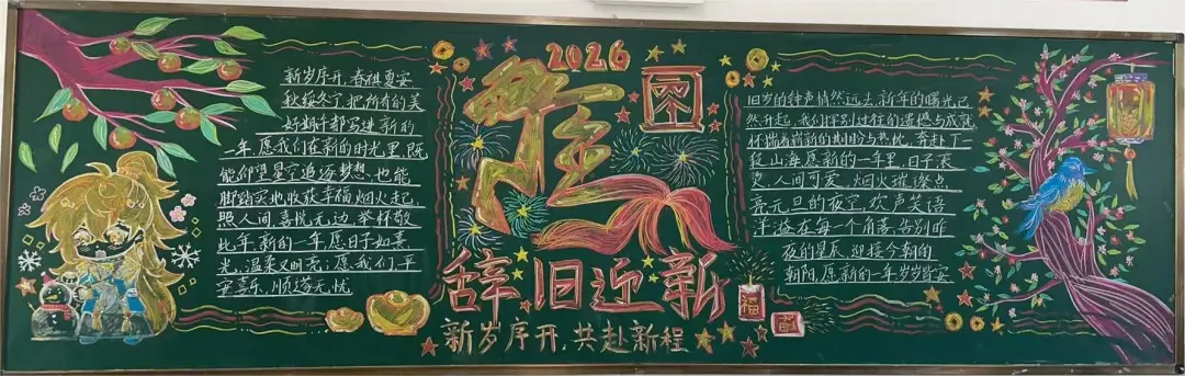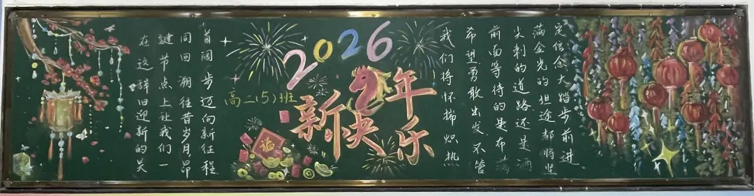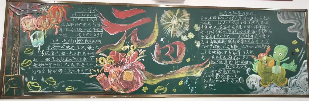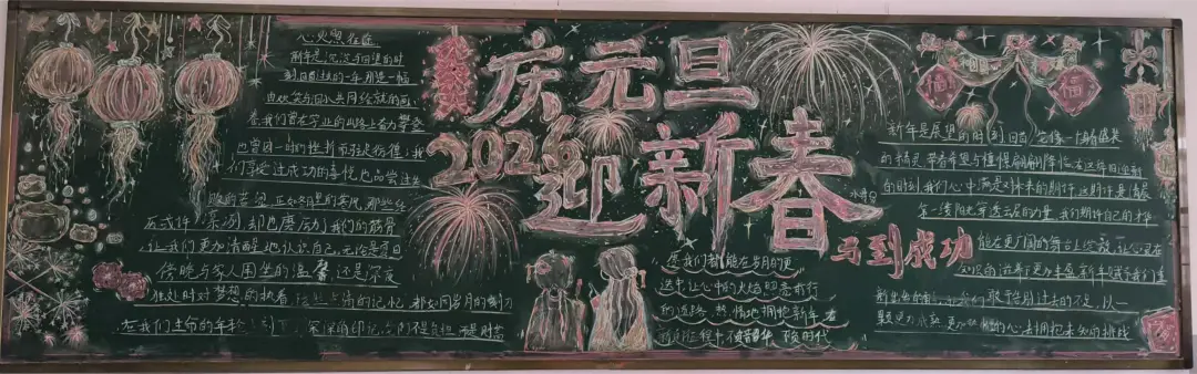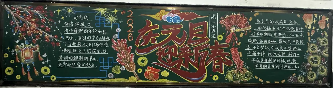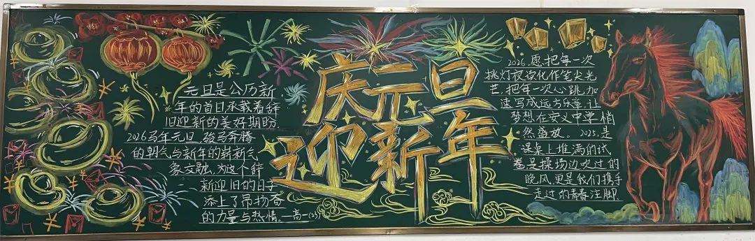 活动中,各班级围绕元旦主题,充分发挥创意和巧思,精心设计黑板报内容,版面形式多样,图文并茂,充分展现了同学们的艺术素养和团队协作精神。部分班级以丰富的创意和真挚的情感展现了元旦主题:有的以‘时光的教室‘为题,描绘教室里的欢笑声与黑板上的祝福语,传递出对新年的美好期待;有的以‘新征途‘为题,展现出同学们勇敢前行、迎接未来的坚定信念;还有的通过‘跃马跨越重重挑战‘‘心火照亮前行道路‘‘新岁序开,共赴新程‘等富有感染力的语言,激励同学们在新的一年奋发向上,营造出浓厚的节日氛围和积极向上的精神风貌。