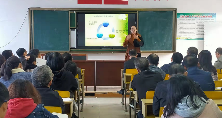 在此次培训活动中,安义中学心理辅导中心老师高翠萍为班主任作了题为《做好学生心理健康工作》的专题讲座。针对当前社会教育背景下学生的心理健康问题及应对方法,高翠萍老师从“心理疾病与非病三原则”、“判断精神活动正常与异常”、“沟通方式”和“如何处理”四个方面为老师们做了详细且深入的讲解。讲解中,高老师结合日常教学工作中的心理健康辅导案例,给各位班主任介绍了很多实用的心理教育实施策略,满满的干货,让班主任对学生的思想辅导工作有很强的指导性。