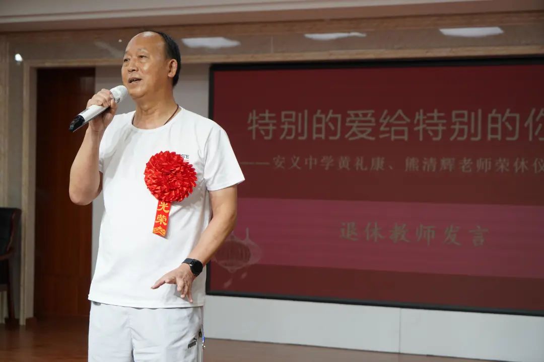 两位青年老师提到两位退休教师从教几十年来勤勤恳恳,兢兢业业,桃李不言,下自成蹊。感谢两位老师平时对年轻教师的帮助和指导。王小艳老师说:‘秉心克慎,奉职惟勤。黄礼康老师一生嫉恶如仇,奉守师德。不媚上不欺下,堂堂正正做人,踏踏实实办事,成为一个真正的大写的人,一个为人称道的人,一个始终受到大家敬重的人。‘刘星华老师说:‘学校领导在全校教职工大会上为即将退休的老师举行退休仪式,这聚人心、暖人心、激人心、汇人心、得人心的做法值得点赞,这是历史性的……熊清辉老师41年的教学历程,运动场、教室里,为学生讲人生,讲做人,讲知识,关注学生成长,成人,成才,为学生们开心过,被学生们伤心过,为学生们自豪过,也被他们感动过……‘两位老师最后都表达了对黄老师和熊老师的不舍之情,邀约他们退休之后‘常回家看看‘,衷心祝愿黄老师、熊老师合家欢乐,身体健康,万事如意。