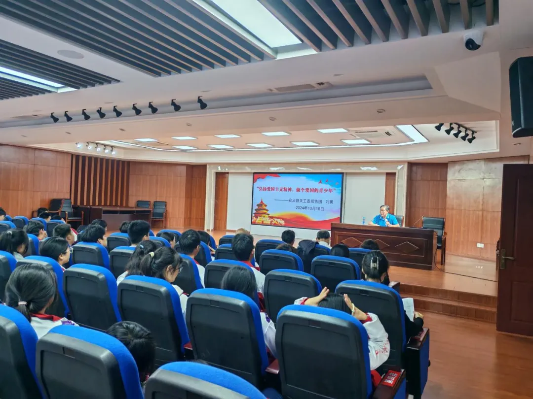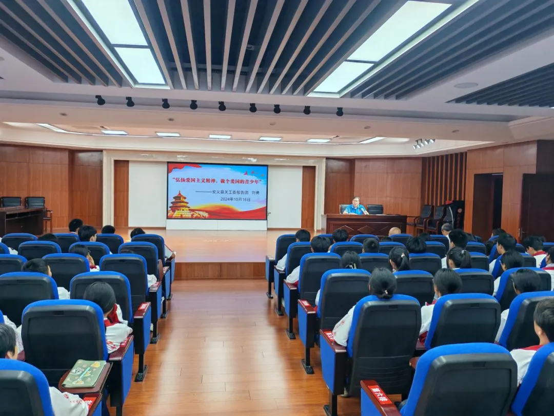 为深入贯彻爱国主义精神,弘扬社会主义核心价值观,激发青少年学生的爱国热情和责任感,10月16日下午,安义县关工委报告团走进安义中学,开展了一场以‘弘扬爱国主义精神,做个爱国的青少年‘为主题的宣讲活动,现场氛围庄重热烈。本次活动由安义中学余秀秀校助主持,安义中学校长刘婷婷、学校团委书记夏霆、团委副书记魏莹以及高一20班和21班两个班级的学生参加了此次活动。