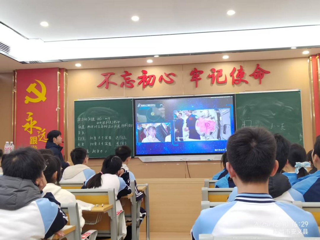 12月10日,高一物理《超重和失重》教学展示在我校接续进行。安义中学王令文老师以电梯视频导入,通过希沃投屏实时展示学生蹲下站起时体重秤示数变化,设计‘抛书抽纸‘‘矿泉水瓶落水‘等互动实验,让学生在亲身参与中感知完全失重现象,充分践行‘学生为主体‘的教学理念。
