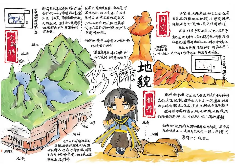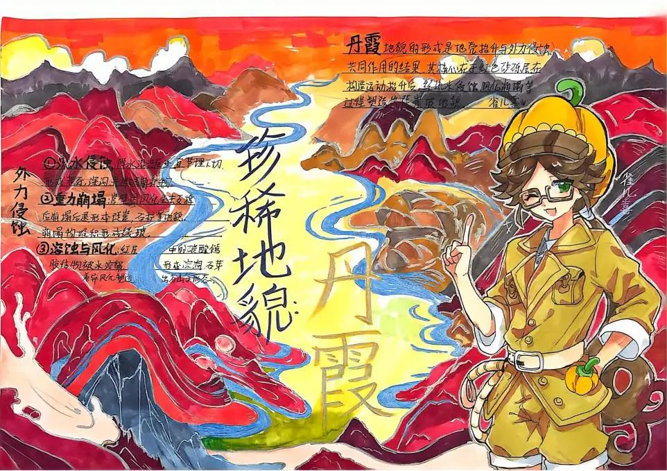 这两幅是出色的‘自然地理类‘作品。作者以‘丹霞地貌‘为研究对象,精美地绘制了丹霞景观,并清晰阐释了其在地壳运动(内力作用)与流水侵蚀、风化(外力作用)共同塑造下的形成过程。作品将抽象的地理原理转化为直观的图像,色彩运用大胆而协调,充分展现了自然地理的壮美与科学奥秘。