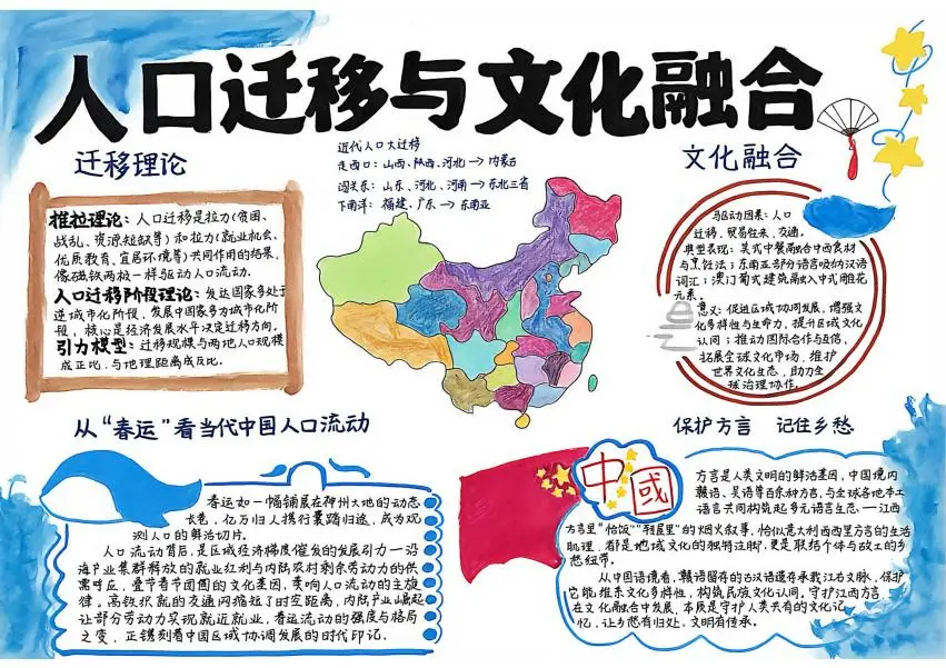 该作品属于‘人文地理类‘主题。作者以宏大的视角,结合推拉理论,分析了中国历史上及当代的人口迁移现象,并深刻阐述了由此带来的文化融合。作品特别以‘春运‘为鲜活案例,解读了当代中国人口流动背后的经济、社会与文化动因。版面以中国地图为视觉中心,穿插历史迁移路线与当代春运数据图表,图文并茂,充满时代感与人文关怀。