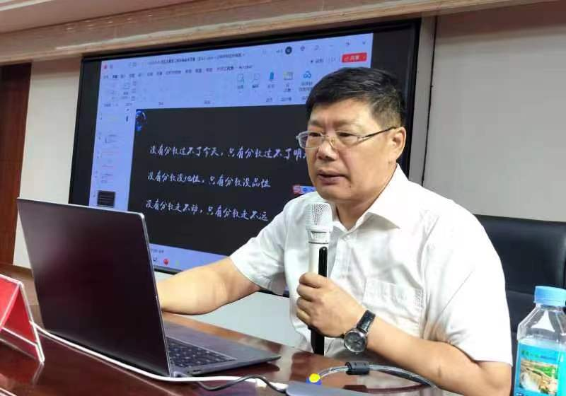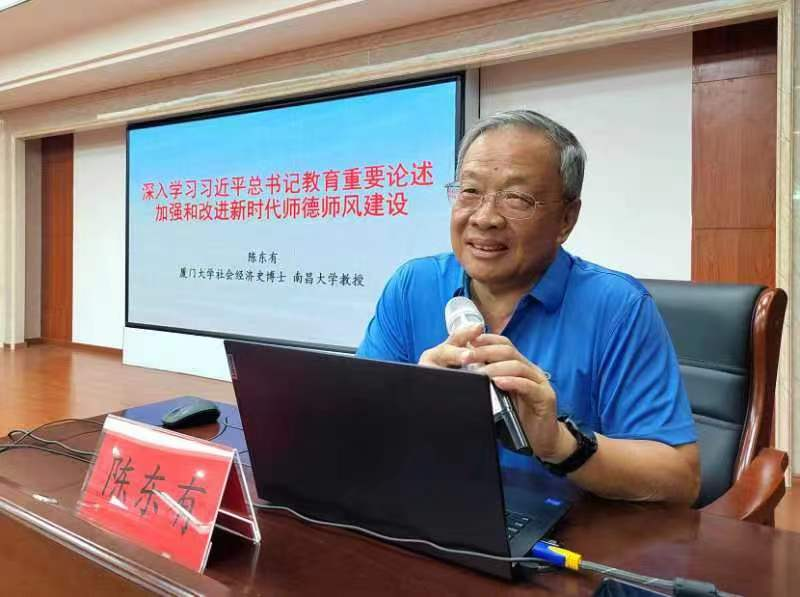 8月28日上午9:00-12:00,南昌大学教授、博士生导师陈东有作《深入学习习近平总书记教育重要论述 加强和改进新时代师德师风建设》主题讲座。他从党的二十大报告中有关教育(教师)使命的表述入手,提出以中国式现代化全面推进中华民族伟大复兴,实施科教兴国战略,强化现代化建设人才支撑,办好人民满意的教育,随后又结合‘苏区精神‘的江西红色故事,提出要在红色基因的赓续传承中吸取缔造人民教师队伍的良好师德师风所需的精神养料。他的讲课以号召全场教师一同宣誓‘学为人师,行为世范‘结尾,老师们誓言铿锵有力,随后会场上掌声雷动经久不息。
