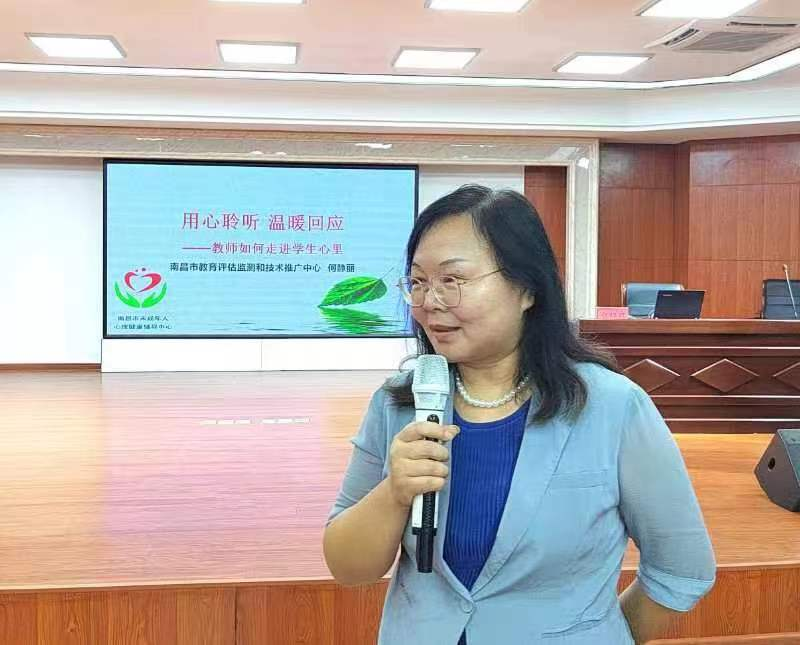 8月26日下午15:00-18:00,南昌市教科所副主任何静丽作以《用心聆听,温暖回应——教师如何走进学生心里》为题的讲座。她首先分享了自己用心聆听处于迷茫中的青少年及其父母的心声,进而引导他们走出曾经的心理困境的工作经历:过去15年来,举办900多期家长沙龙,直接面对超过15000人次家长。随后从宏观层面切入,介绍当前中国青少年心理健康建设现状与发展趋势,引导新教师思考,学会观察、应对学生的心理变化,并与之建立良好的心理联系,维系健康的师生互动关系,从而顺利完成日常的教育教学工作。