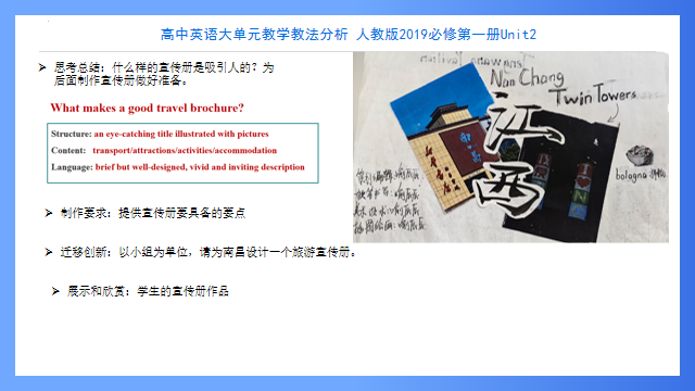 精彩课例展示:英语必修一第二单元‘旅游‘主题语境下的阅读课—‘探索秘鲁‘,刘欣老师这样导入本课:猜国家,预热新词;带着任务看视频,激发兴趣,创设情境。然后初步感识,理清文章框架,帮助学生选择合适的秘鲁旅游景点。提出问题:如果你有机会去秘鲁游玩,会选择哪条旅游路线?为什么?引出宣传册,思考总结:什么样的宣传册是吸引人的?在授课过程中,刘老师在引导大家总结宣传册所具备的要点的同时,适时地以小组为单位,让同学们也为南昌设计这样一个旅游宣传册。最后展示和欣赏学生的宣传册作品《我爱英雄城南昌》。