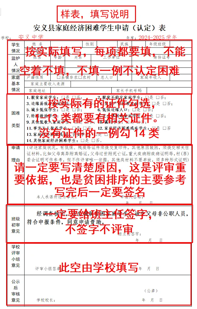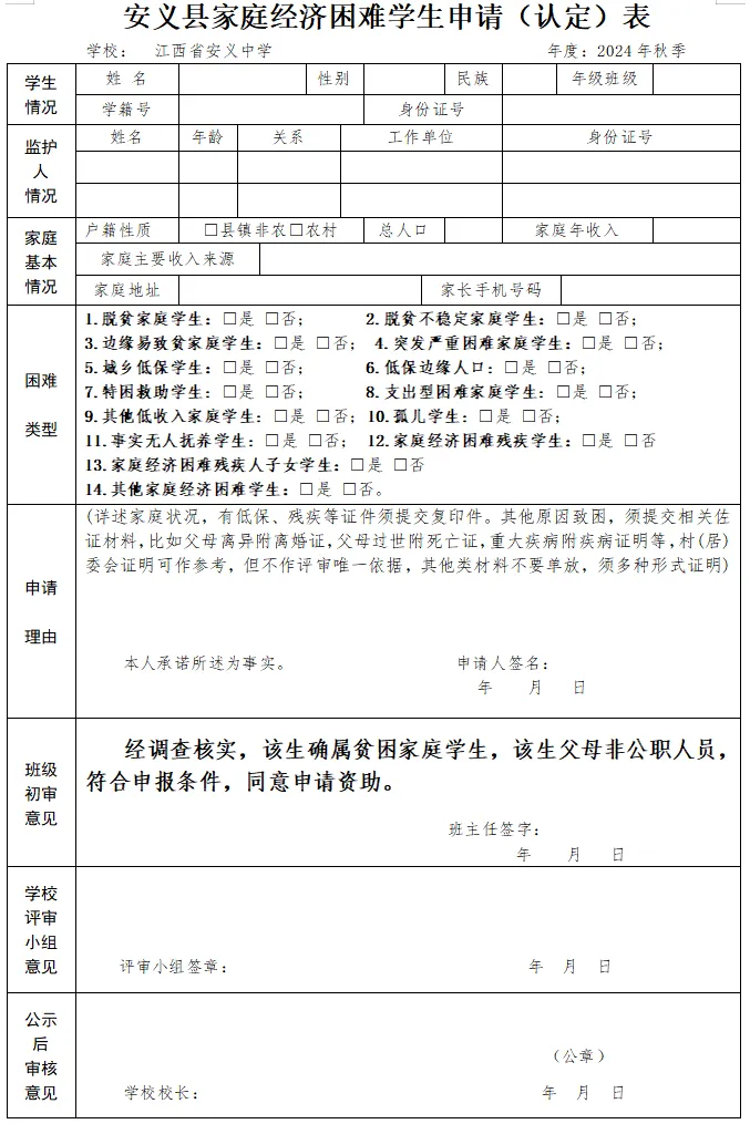附件1:安义县家庭经济困难学生申请(认定)表及填写样表