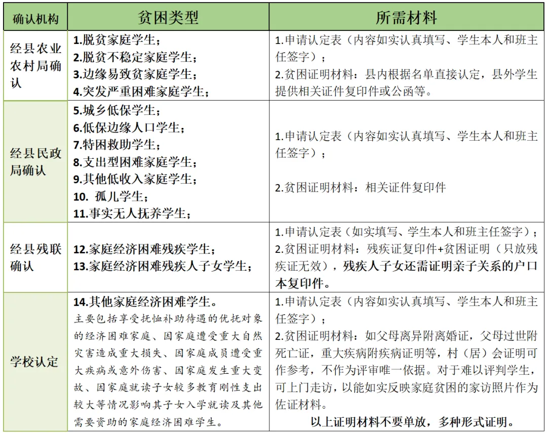 ④1-11类经审核无误后直接享有资助,12-14类经学校评审小组按贫困程度排序确定资助。