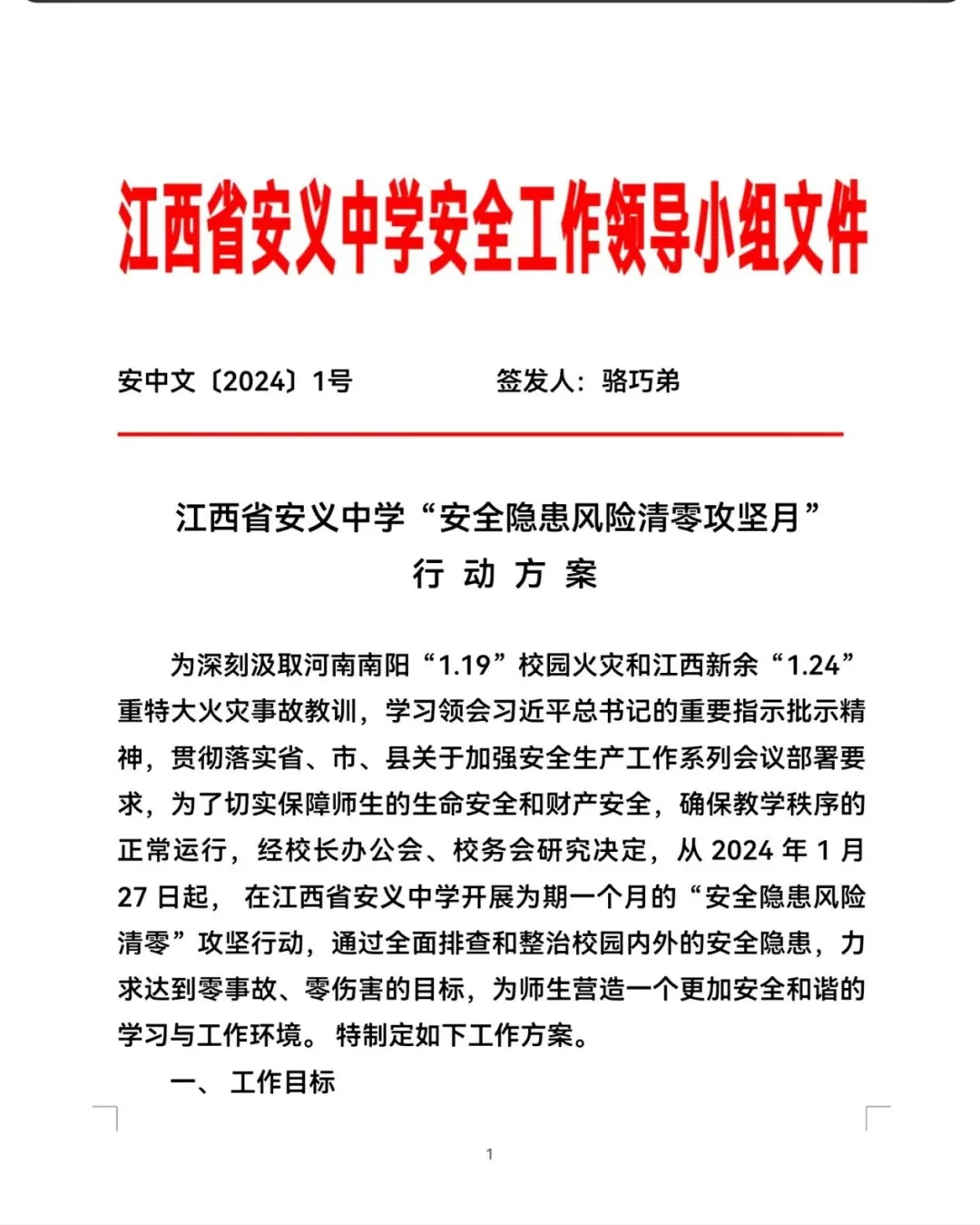 江西省安义中学安全工作领导小组近日发布安中[2024]1号文件,部署开展‘安全隐患风险清零攻坚月‘活动。此次活动通过全面摸排和整改校园安全隐患,提升师生安全意识,确保校园环境安全稳定。