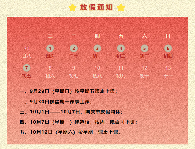 金秋送爽,丹桂飘香,我们即将迎来祖国75周年华诞,衷心祝愿伟大祖国繁荣昌盛。根据国家关于国庆节放假的通知精神,结合我校实际情况,现将2024年国庆节假期安排及相关注意事项通知如下,请大家仔细阅读并做好相应准备。