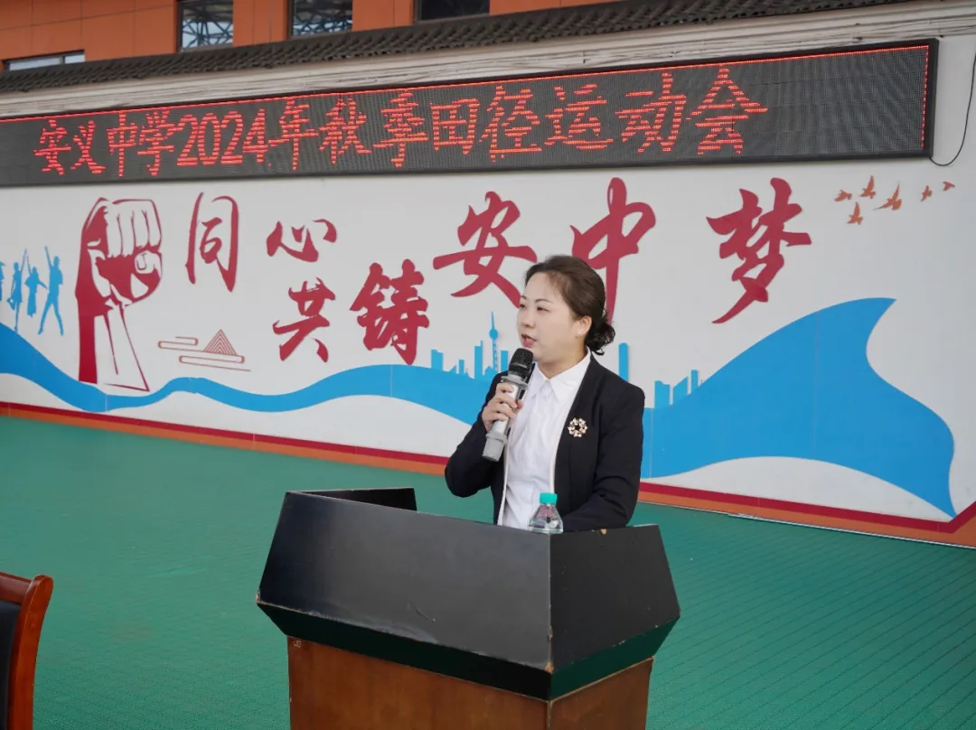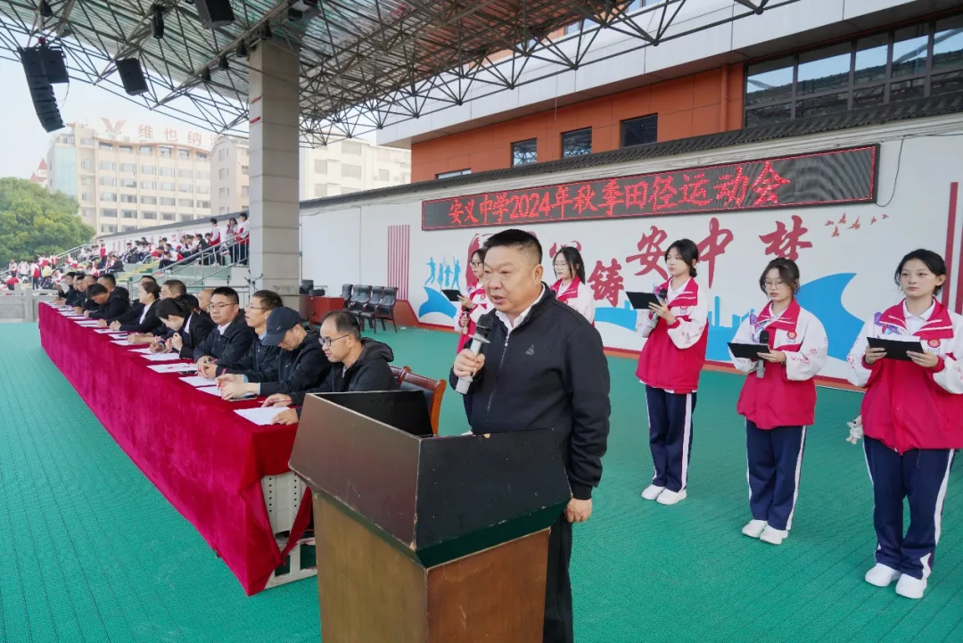 在万众瞩目下,骆书记高声宣布:‘安义中学2024年秋季田径运动会正式开幕!‘声音洪亮,振奋士气,全场欢声雷动。