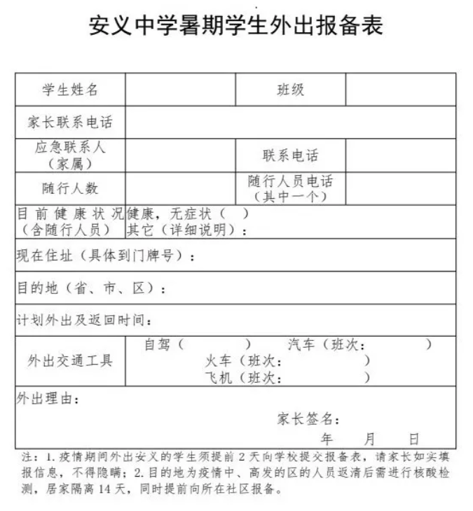 1.减少外出。家长及学生尽量减少不必要外出。原则上不前往国外和国内中高风险区、不跨省域长途旅行、不参加集聚性活动。因特殊情况出省的学生需报告班主任、校领导逐级审批。对假期出入省外学生,返回后严格按照相关政策实行居家观察和隔离措施,严防疫情输入校园。