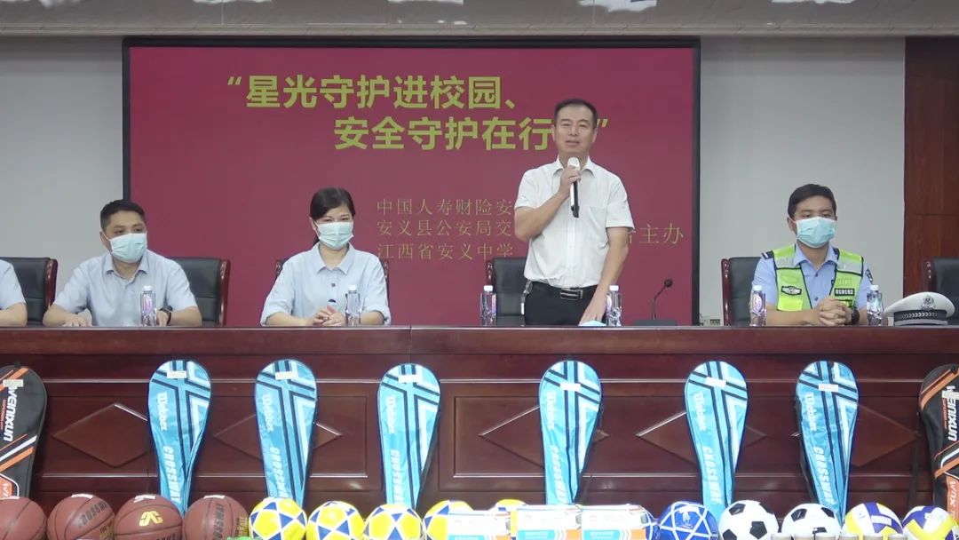 首先由中国人寿财产保险股份有限公司安义县支公司的领导作热情洋溢的致辞。中国人寿财产保险股份有限公司是一家有责任、有担当、有爱心的国有公司,该公司不但联合安义交警大队进入安义中学启动‘星光守护进校园‘活动,而且还坚守着爱的初心,将爱心的光芒播散在安义中学的运动场上,向安义中学捐赠了篮球、足球、排球、羽毛球、乒乓球等价值五千多元的体育器材,安中体艺处负责人种道元代表学校接受捐赠,此次捐赠更加充实了安中体育教学设备,必将助力安中的全面、快速发展。