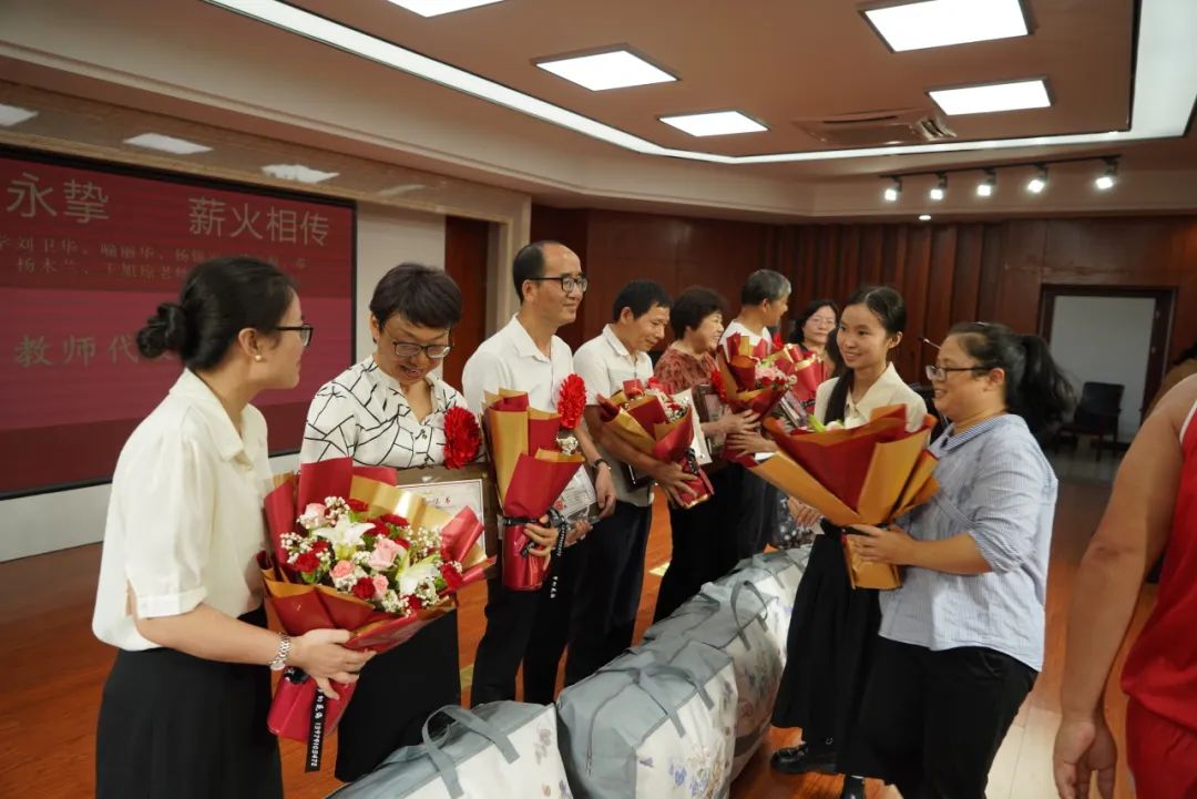 年轻教师代表为退休教师献花