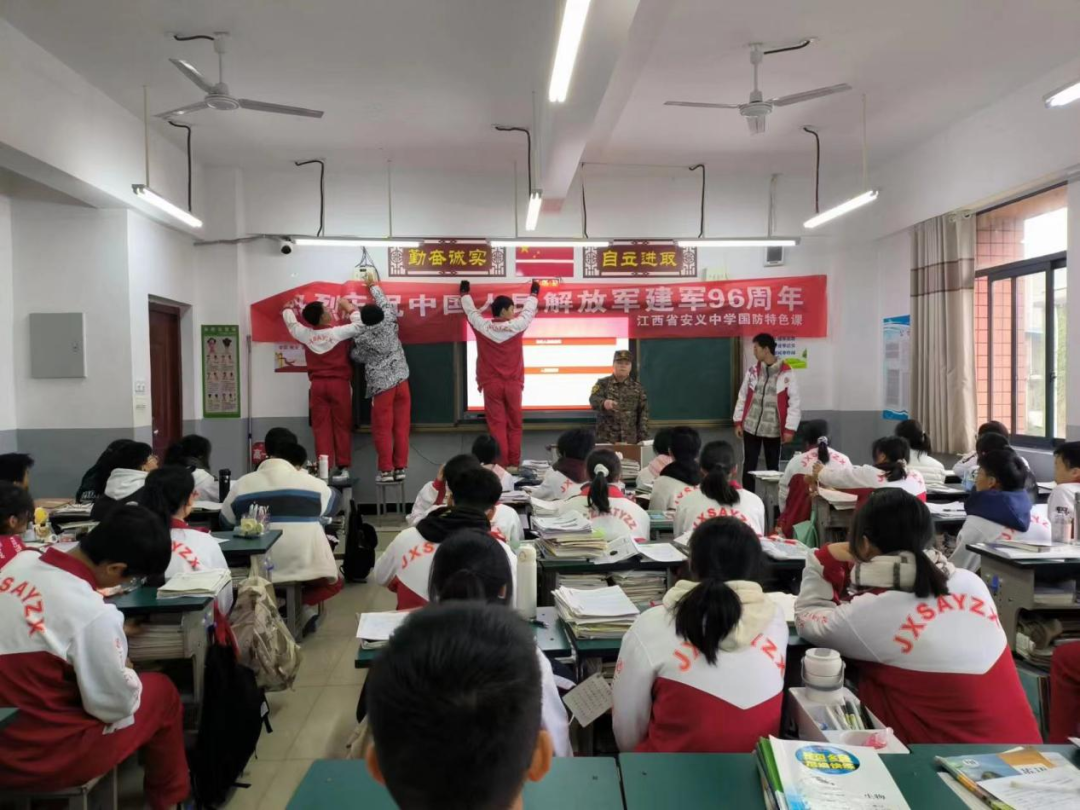 今年是中国人民解放军成立96周年。在‘八一建军节‘来临之际,为了让新时代少年们深情回顾解放军的奋斗历史,继承和发扬解放军的光荣传统和优良作风,明白当今幸福生活来之不易,激发爱国情怀,江西省安义中学组织开展了‘热血铸八一、守护中国梦‘建军节主题国防教育活动。
