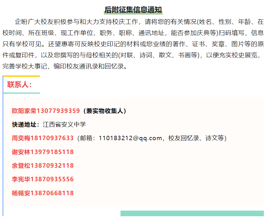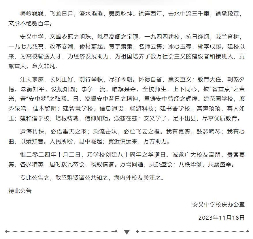 江西省安义中学80周年校庆公告(第一号)